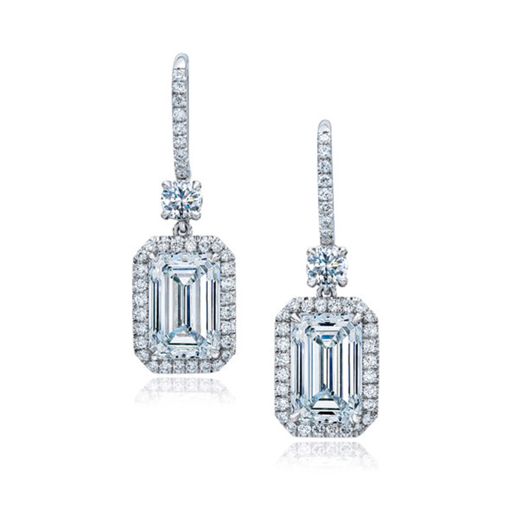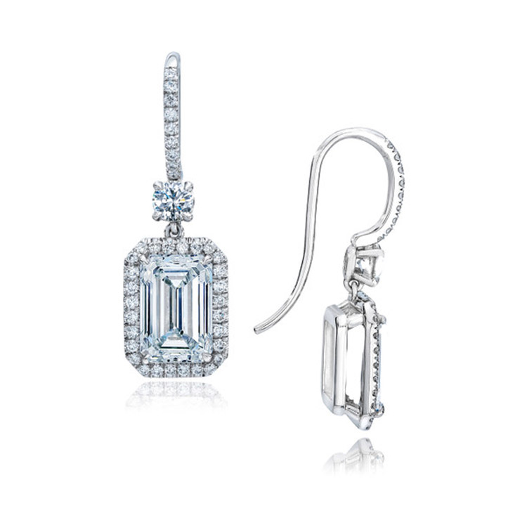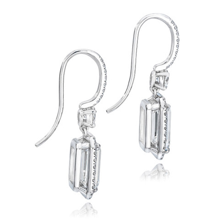Glamorous 30.17 ct Emerald Cut Pave Halo Drop Earrings set in 18K White Gold